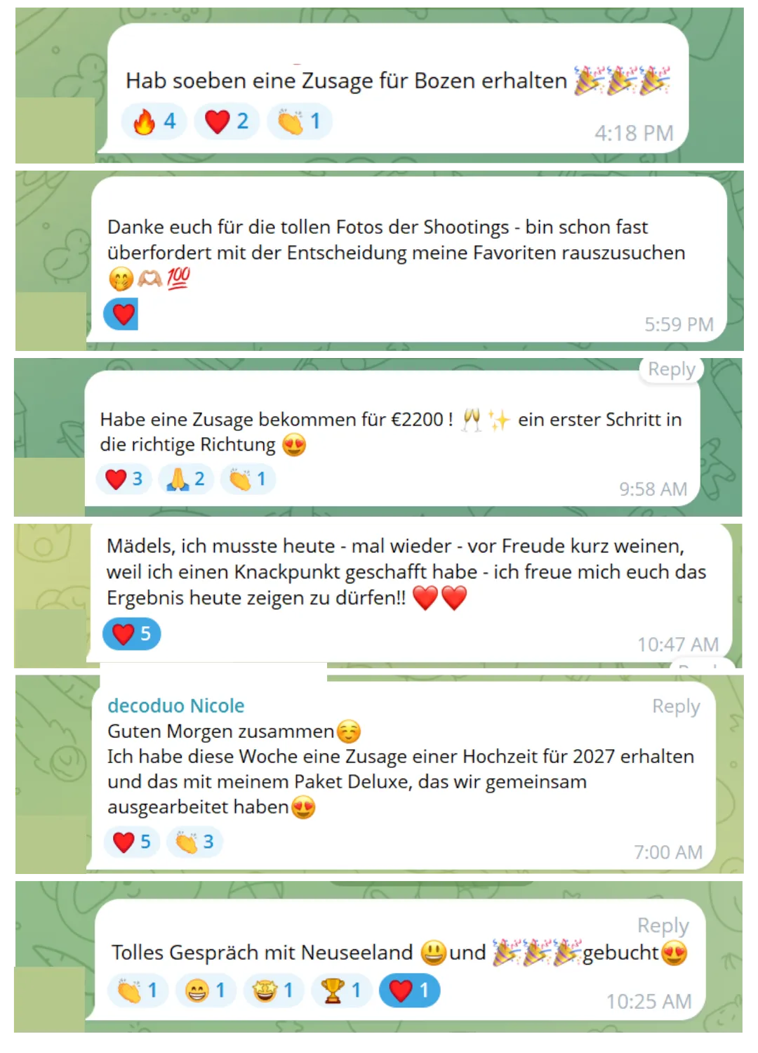 Vernetze dich mit gleichgesinnten Badass-Miracle-Maker Hochzeitsdienstleister! Tausche dich 24/7 aus, teile Erfolge, hole dir Feedback und knüpfe wertvolle Kooperationen. Diese Kontakte werden dein Business für Jahre voranbringen – viele unserer Mitglieder empfehlen sich gegenseitig weiter.