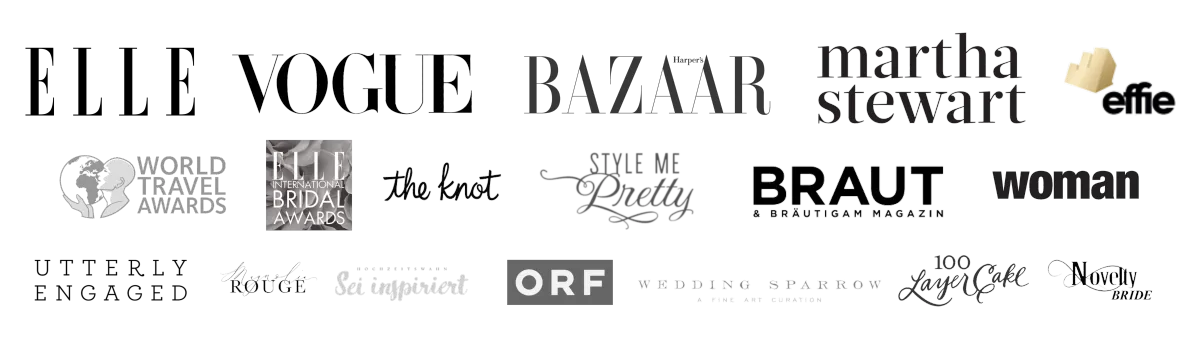 A Very Beloved Wedding® wurde als eine der Top 10 Hochzeitsplanungsagenturen weltweit, eine der Top 2 in Europa und Nummer 1 im deutschsprachigen Raum von den ELLE International Bridal Awards ausgezeichnet und 2025 zum BEST DESTINATION WEDDING PLANNER von den Love Travel Awards gekürt. Unsere Brand ist in 48 Ländern markenrechtlich geschützt und wurde über 400 Mal in führenden Medien weltweit veröffentlicht, darunter ELLE, Vogue, Martha Stewart, Harper's Bazaar und zahlreiche Online-Publikationen.