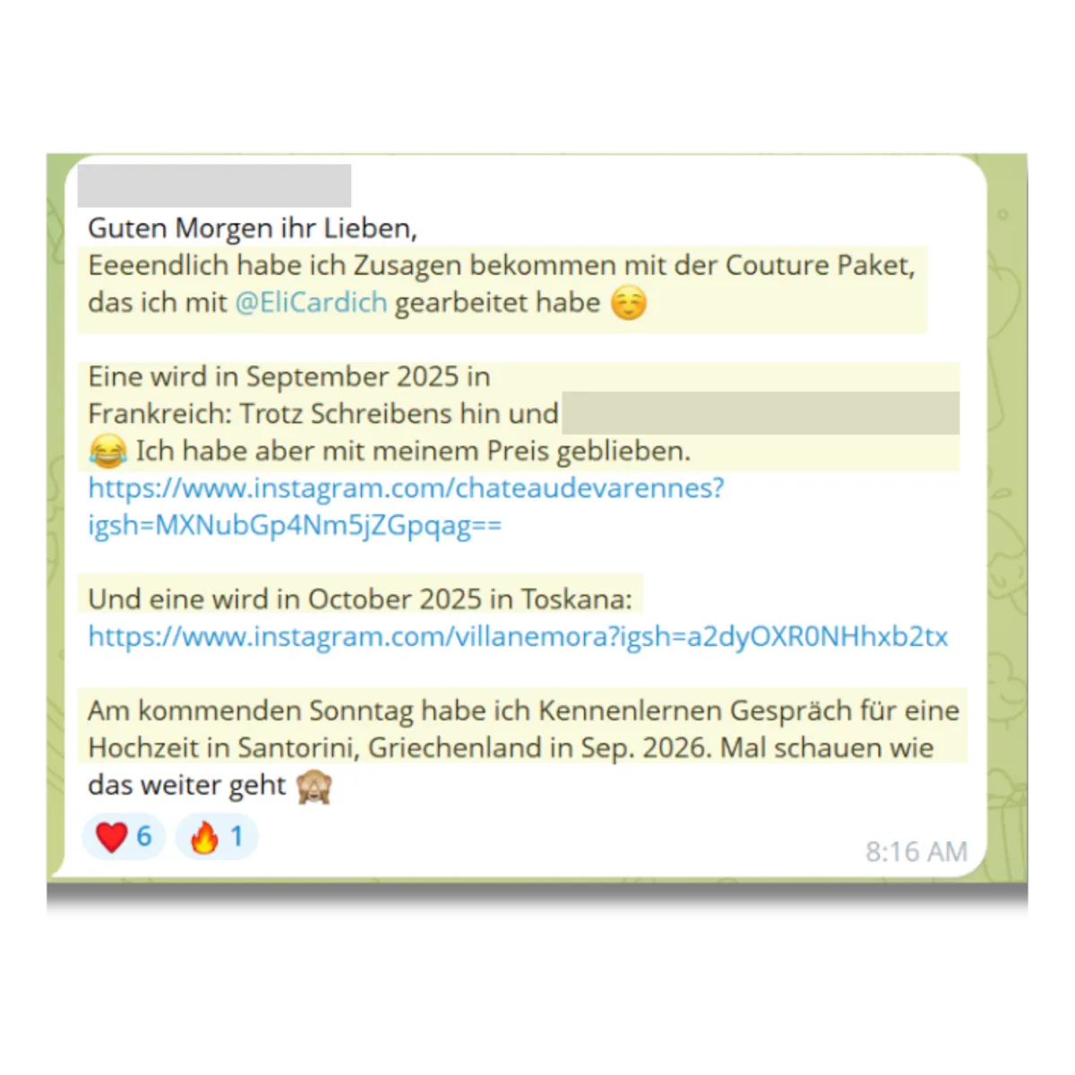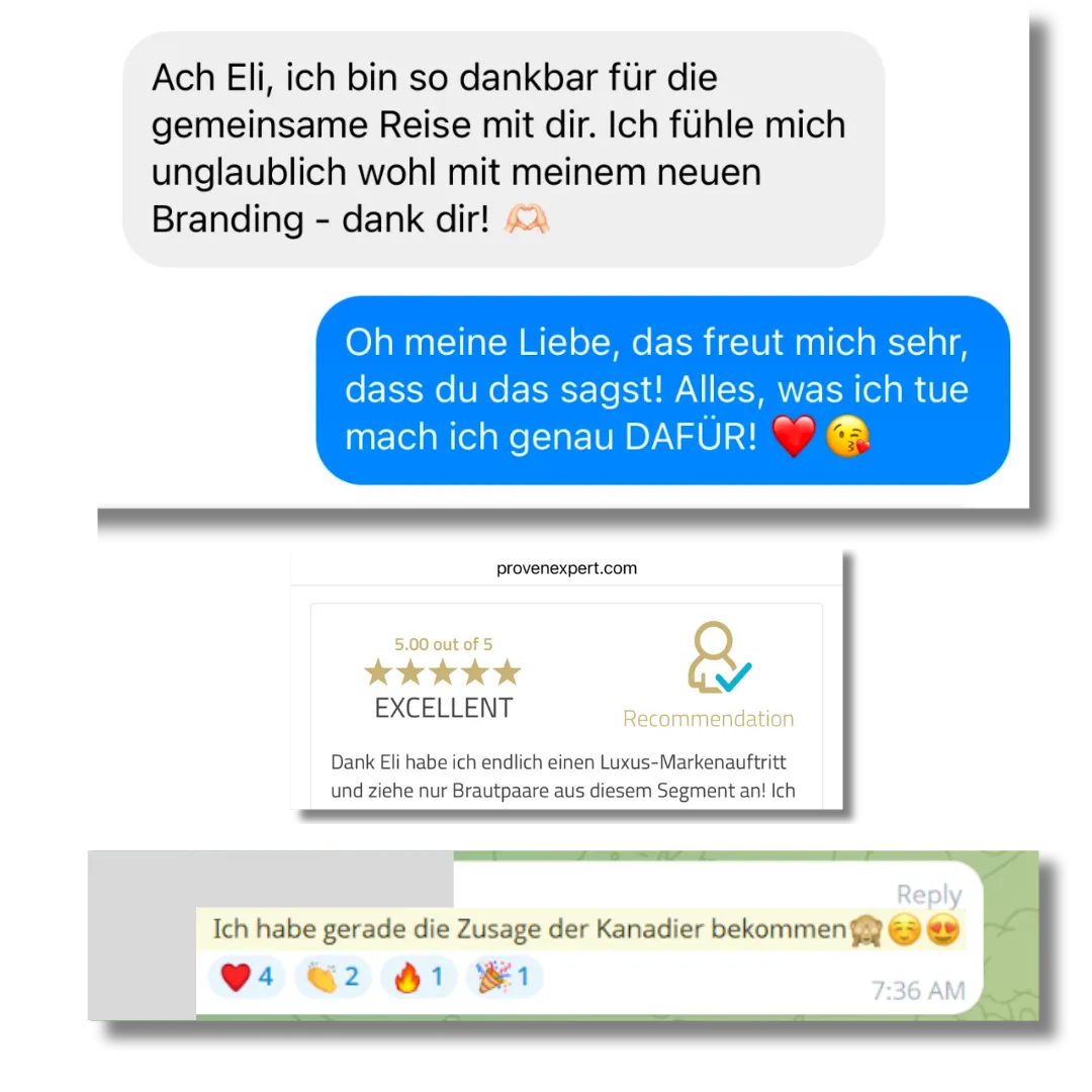 Lösung: Wir haben zuerst an ihrem Angebot und Mindset angesetzt. Inzwischen verkauft sich Sandra nicht mehr unter Wert und sucht sich ihre Brautpaare selbst aus. Ihr Premium-Markenauftritt hat ihr die Tore zur Luxuswelt geöffnet.