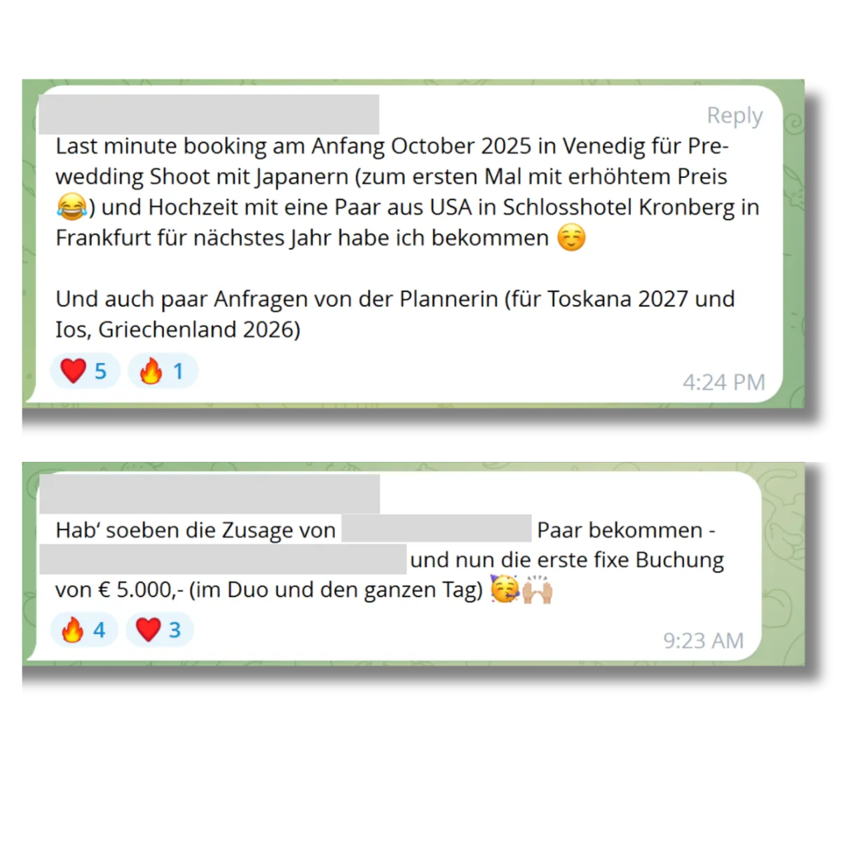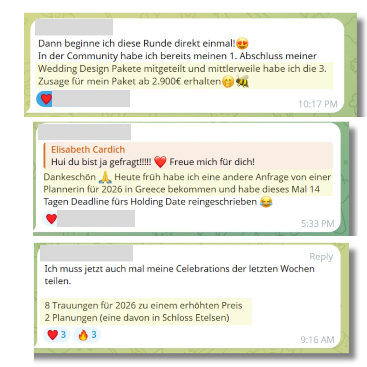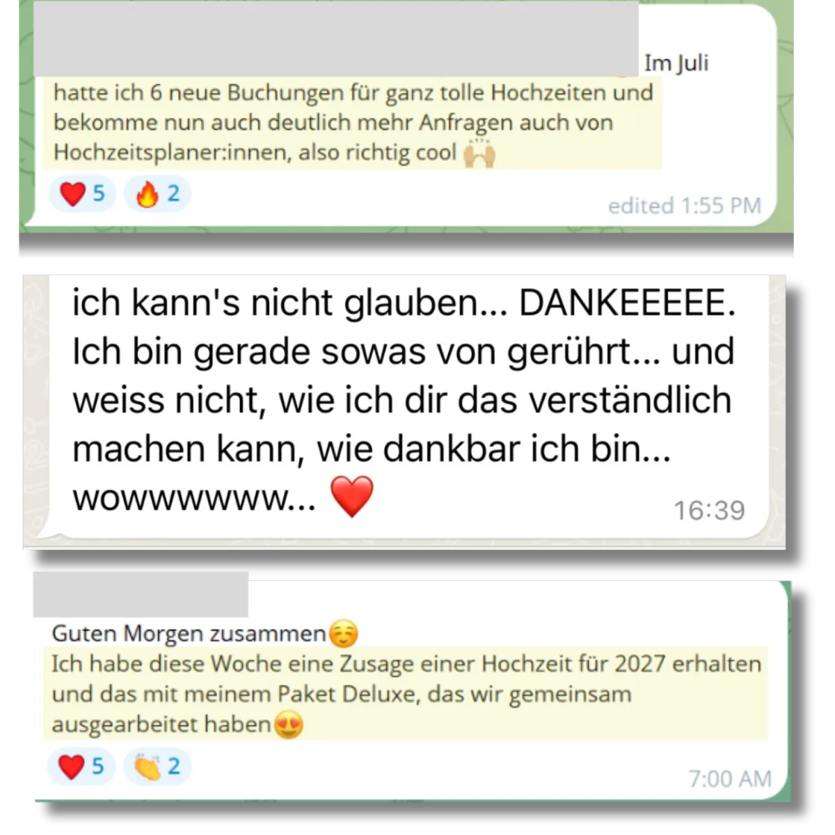 Vernetze Dich mit gleichgesinnten Badass-Miracle-Maker Hochzeitsdienstleister! Tausche Dich 24/7 aus, teile Erfolge, hole Dir Feedback und knüpfe wertvolle Kooperationen. Diese Kontakte werden Dein Business für Jahre voranbringen – viele unserer Mitglieder empfehlen sich gegenseitig weiter.