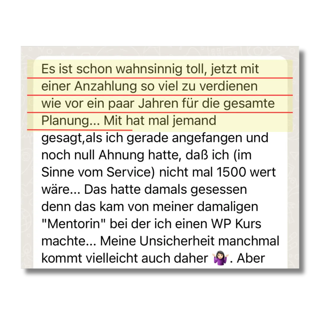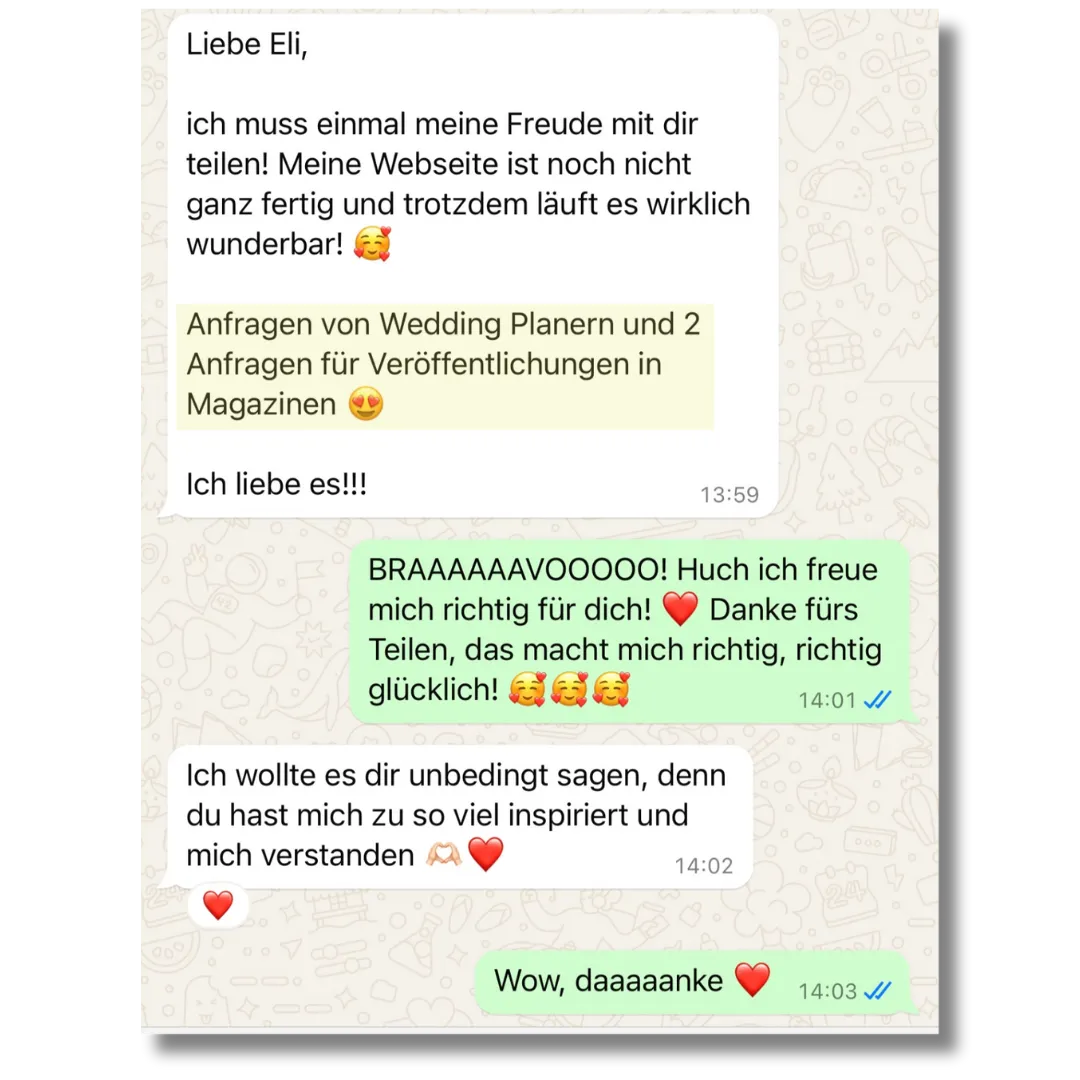 Lösung: Mittlerweile hat Uli wertschätzende Brautpaare für 2026 und 2027 - und ihr Markenauftritt beschert ihr immer mehr hochwertige Anfragen. So macht das Hochzeitsbusiness wieder Freude.